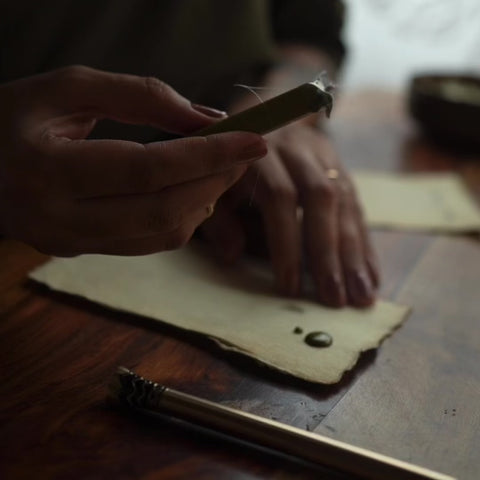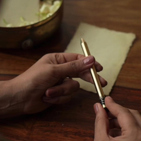 Designed to foster a sense of belonging with yourself in moments of quiet reflection; Qalam has a noticeable heft and charm that serve as mindful cues to slow down. It's twist cap features intricate enameled details and a customizable intaglio seal, making it a unique vessel for your personal journey.